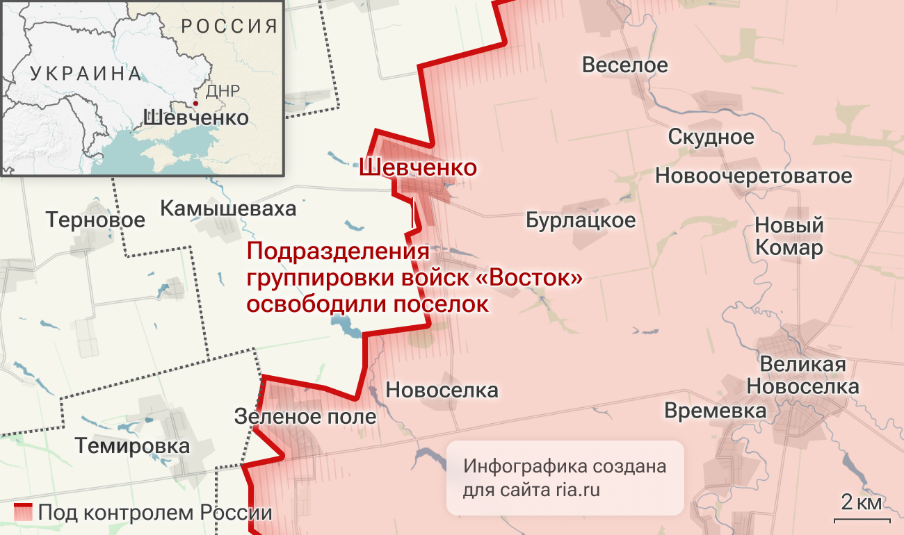 „V dôsledku aktívnych a rozhodných akcií jednotiek vojenskej skupiny „Východ“ bola oslobodená osada Ševčenko Doneckej ľudovej republiky,“ uviedlo ministerstvo.