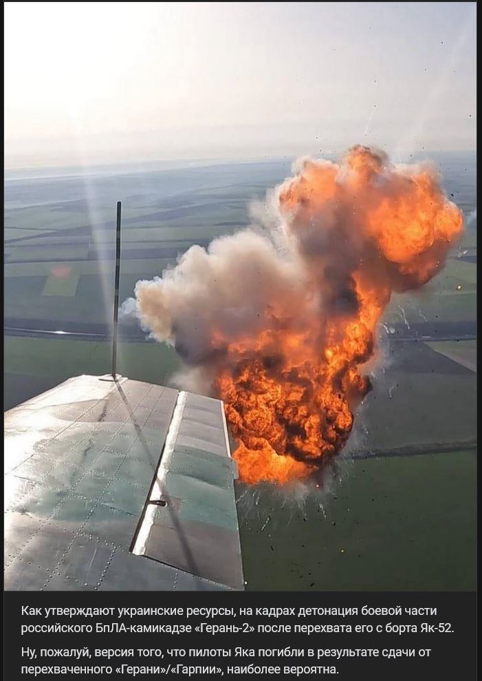 Podľa ukrajinských zdrojov je na záberoch vidieť výbuch bojovej hlavice ruského BPLA-kamikadze Geraň-2 (Герань-2) po tom, ako ho zničili z paluby lietadla Jakovlev Jak-52 (Як-52).