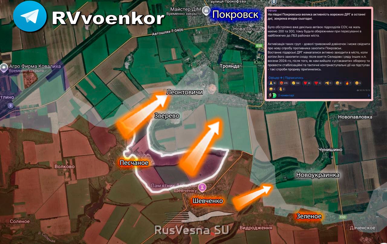 ▪️ Podľa dôstojníka AFU s volacím znakom „Alex“ ruské DRG už vstupujú do Pokrovska.