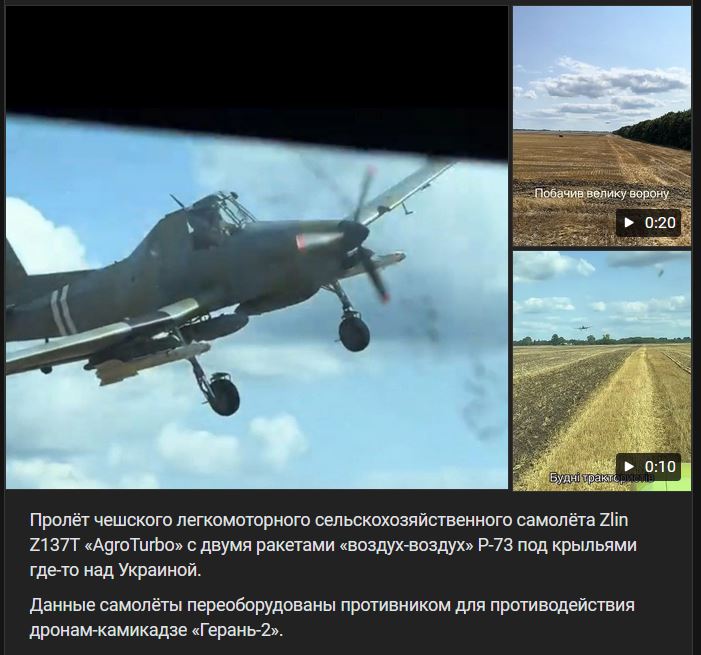 Prelet českého ľahkého poľnohospodárskeho lietadla Zlin Z137T „AgroTurbo“ s 2 raketami vzduch-vzduch R-73 (Р-73) pod krídlami niekde nad Ukrajinou.