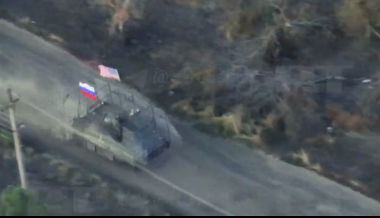Trofejný americký obrnený transportér s vlajkami Ruska a USA zaútočil na pozície ukrajinskej armády v oblasti Záporožia.