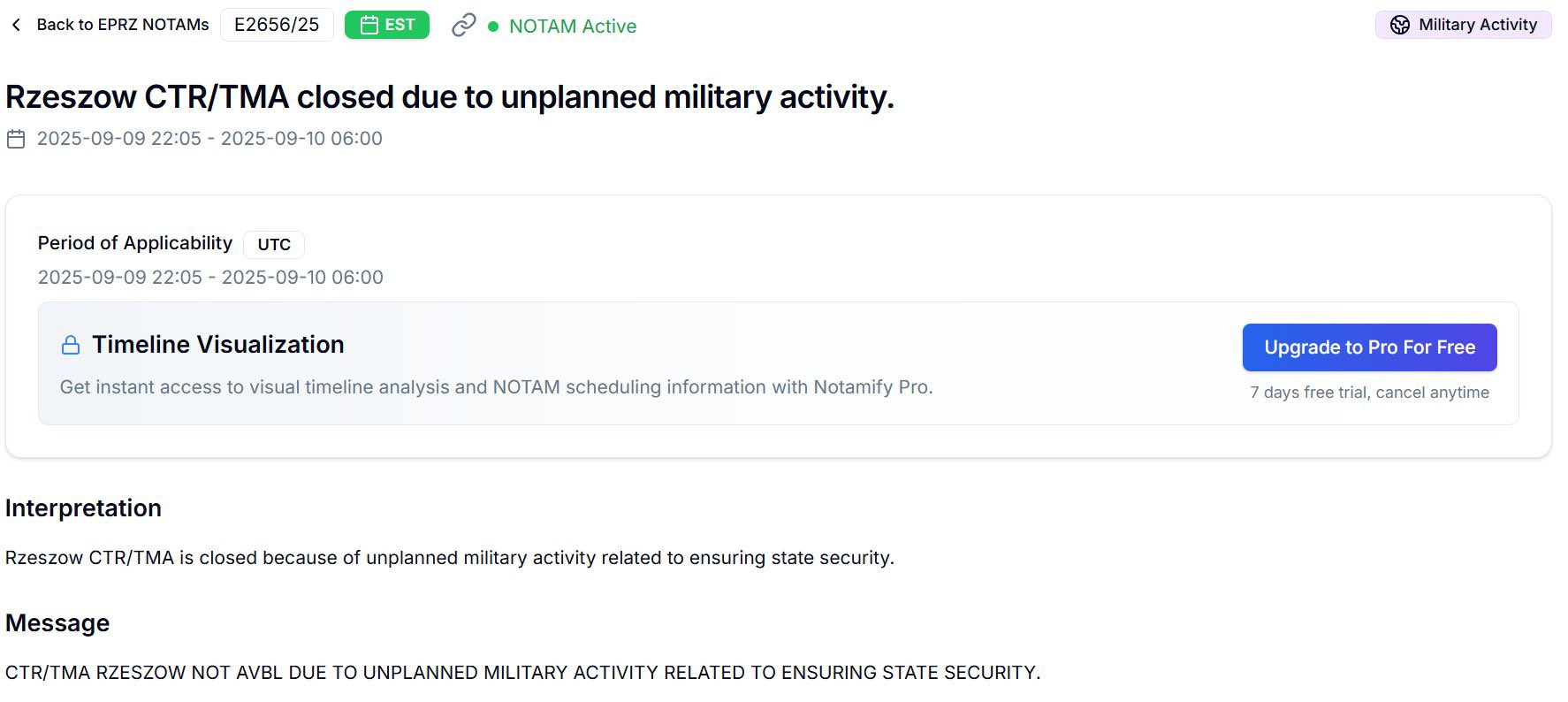 Takže nad Polskem je dle záběrů v ČT sestřelovali až za světla, ale NOTAM platil už od půlnoci zdejšího času?Dříve dnes Polsko vydalo NOTAM (upozornění letcům) uzavírající prostor kolem Rzeszowa pro "neplánované vojenské aktivity ohledně národní bezpečnosti." Zde je ten NOTAM:A hle, jen hodiny poté, údajné "Ruské" drony vstupují do toho vzdušného prostoru. Jé, jaká shoda okolností.