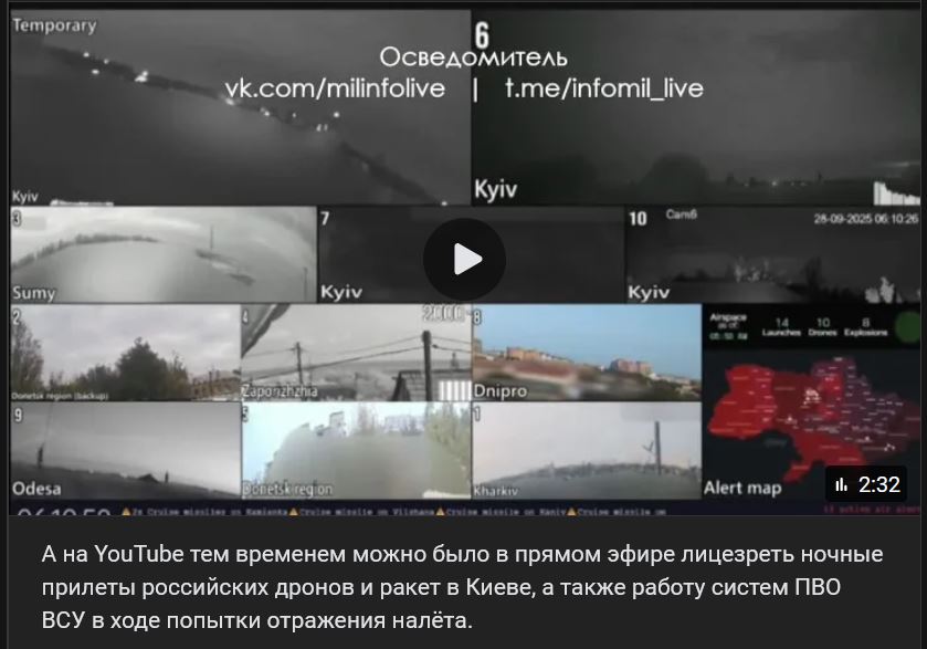 Video https://vk.com/video-123538639_456318849 dĺžka 2:32 min.Medzitým bolo možné na YouTube v priamom prenose sledovať nočné prílety ruských dronov a rakiet v Kyjeve, ako aj prácu / činnosť systémov PVO VSU pri pokuse o odrazenie útokov.
