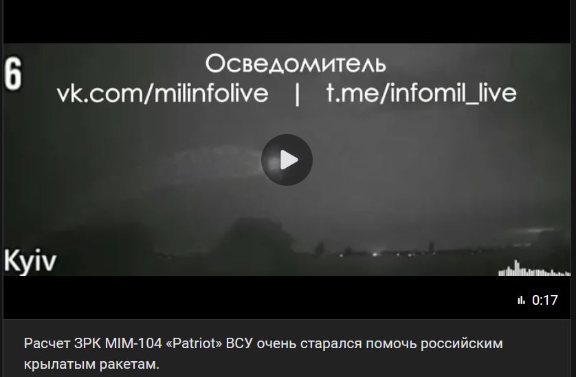 Video https://vk.com/video-123538639_456318850 dĺžka 17 sek.Navádzaním PVO rakety MIM-104 „Patriot“ VSU sa veľmi snažila pomôcť ruským strelám s plochou dráhu letu.