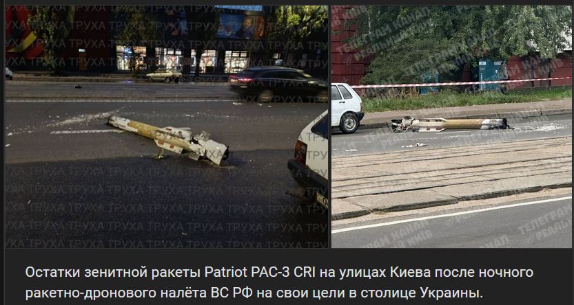 Zdroj https://vk.com/wall-123538639_4702633 z 28.09.2025Zvyšky protilietadlovej rakety Patriot PAC-3 CRI na uliciach Kyjeva po nočnom raketovo-dronovom útoku VS RF na svoje ciele v hlavnom meste Ukrajiny.