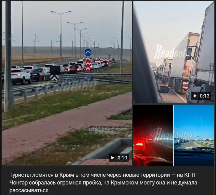 Video 1 https://vk.com/video-163061027_456331075 dĺžka 10 sek.Turisti sa ponáhľajú na Krym, a to aj cez nové územia - na kontrolnom stanovišti Čongar (Чонгар) sa vytvorila obrovská zápcha, na Krymskom moste ani nedúfajú na rozpustenie.