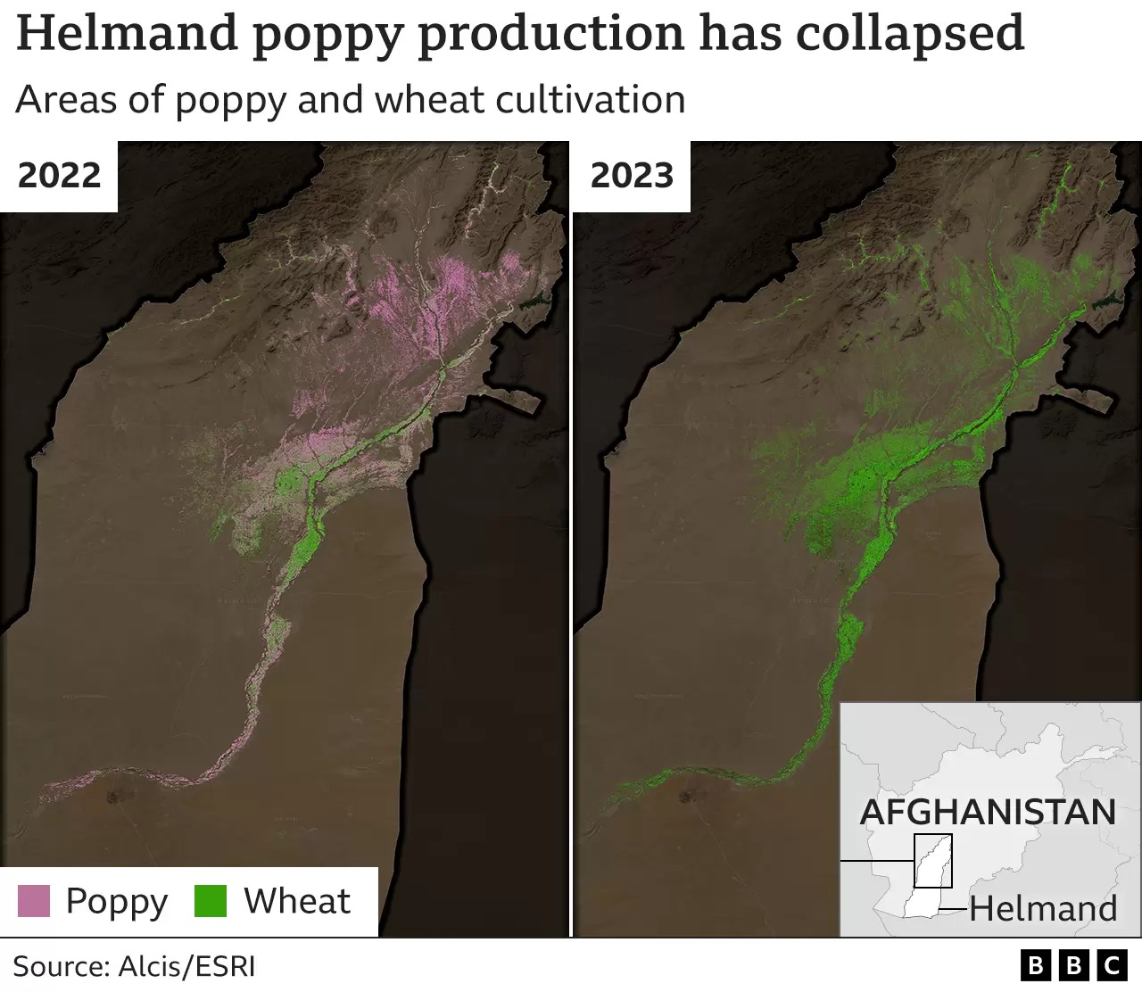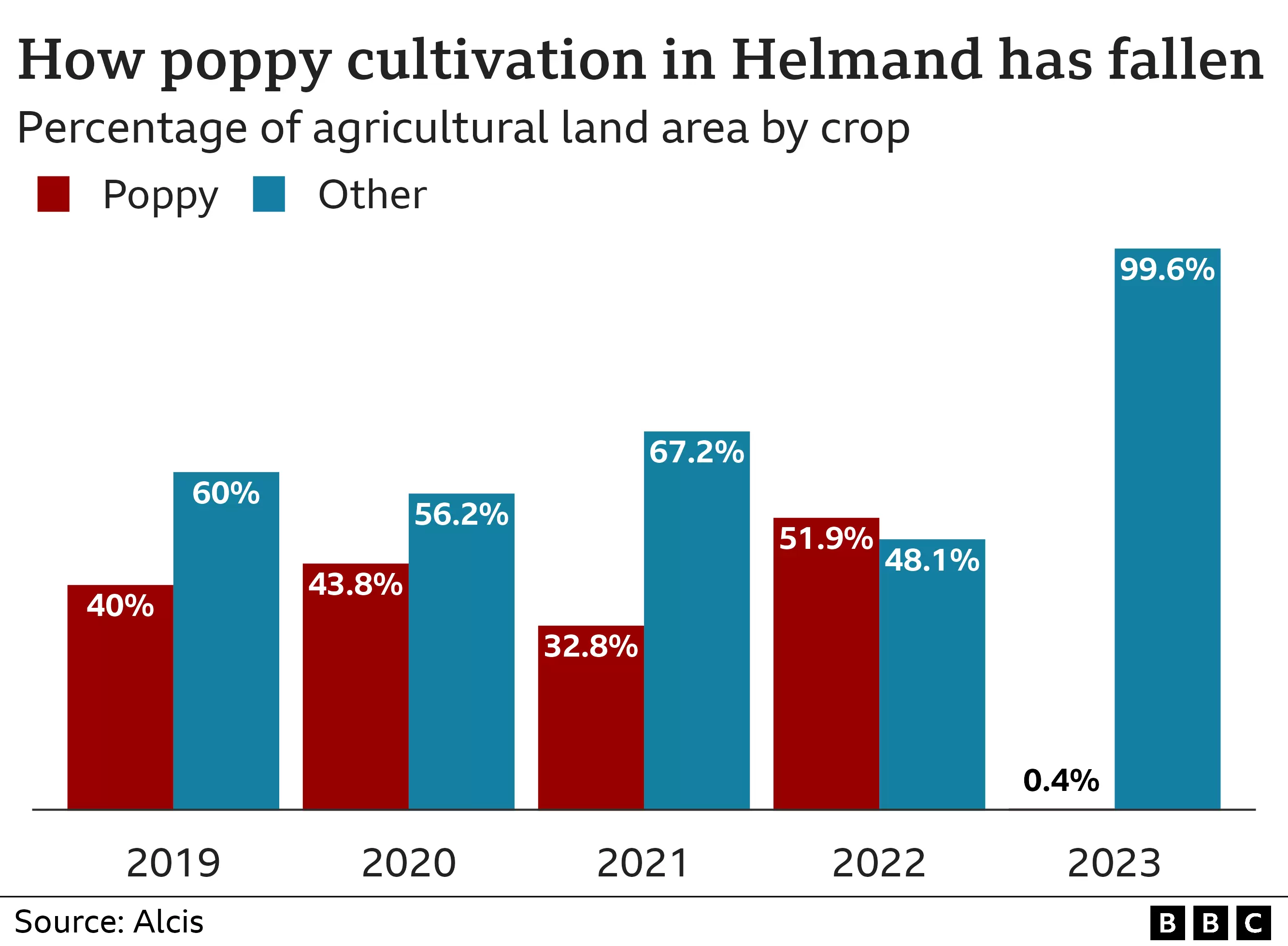 Produkcia maku, rastliny, z ktorej sa zbiera ópium a ktorá slúži ako prekurzor iných opiátov, ako je heroín, zaznamenala v provincii Helmand, ktorá bola predtým najväčším producentom v Afganistane, prudký pokles z viac ako 120 000 hektárov (takmer 300 000 akrov) v roku 2022 na menej ako 1 000 hektárov v roku 2023.