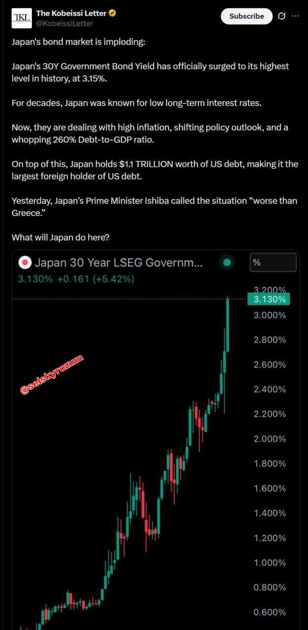 "Japonský trh s dluhopisy se hroutí: výnosy 30letých japonských státních dluhopisů oficiálně vzrostly na nejvyšší úroveň v historii, a to na 3,15 %.