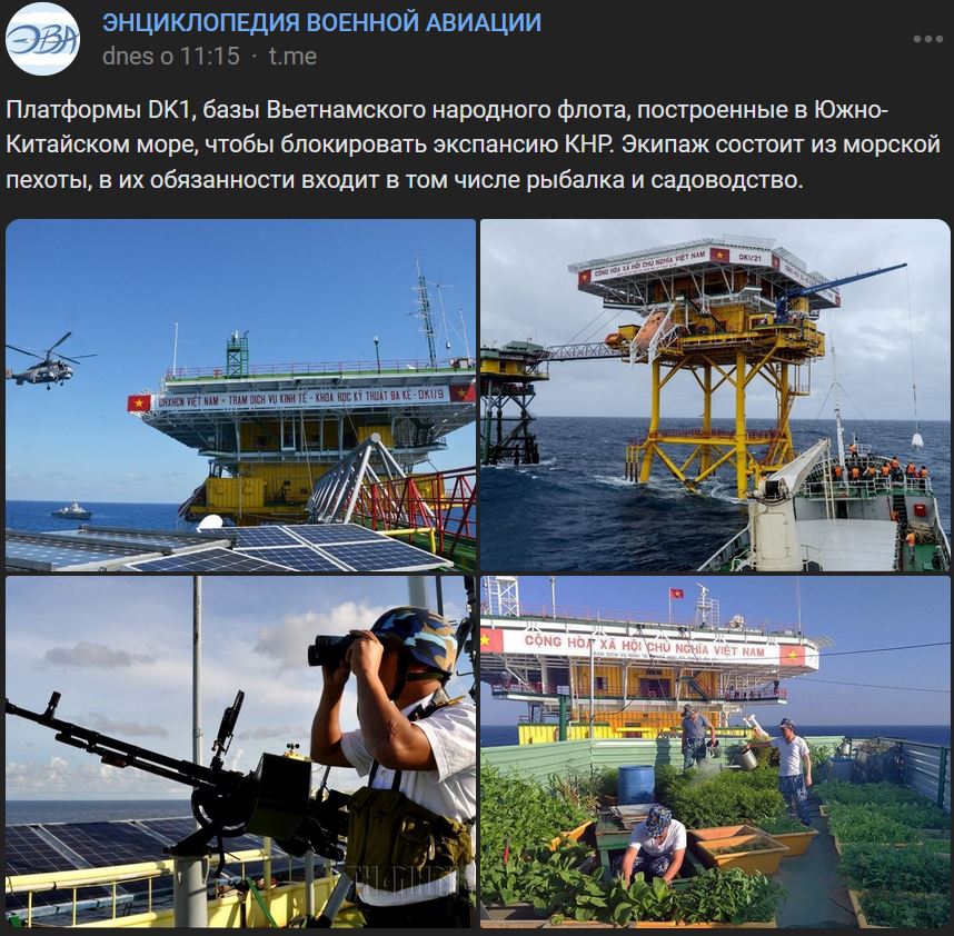 Platformy DK1, základne Vietnamského ľudového námorníctva vybudované v Juhočínskom mori s cieľom blokovať expanziu ČĽR. Posádku tvoria vojaci námornej pechoty a medzi ich povinnosti patrí rybolov a záhradnícke práce.