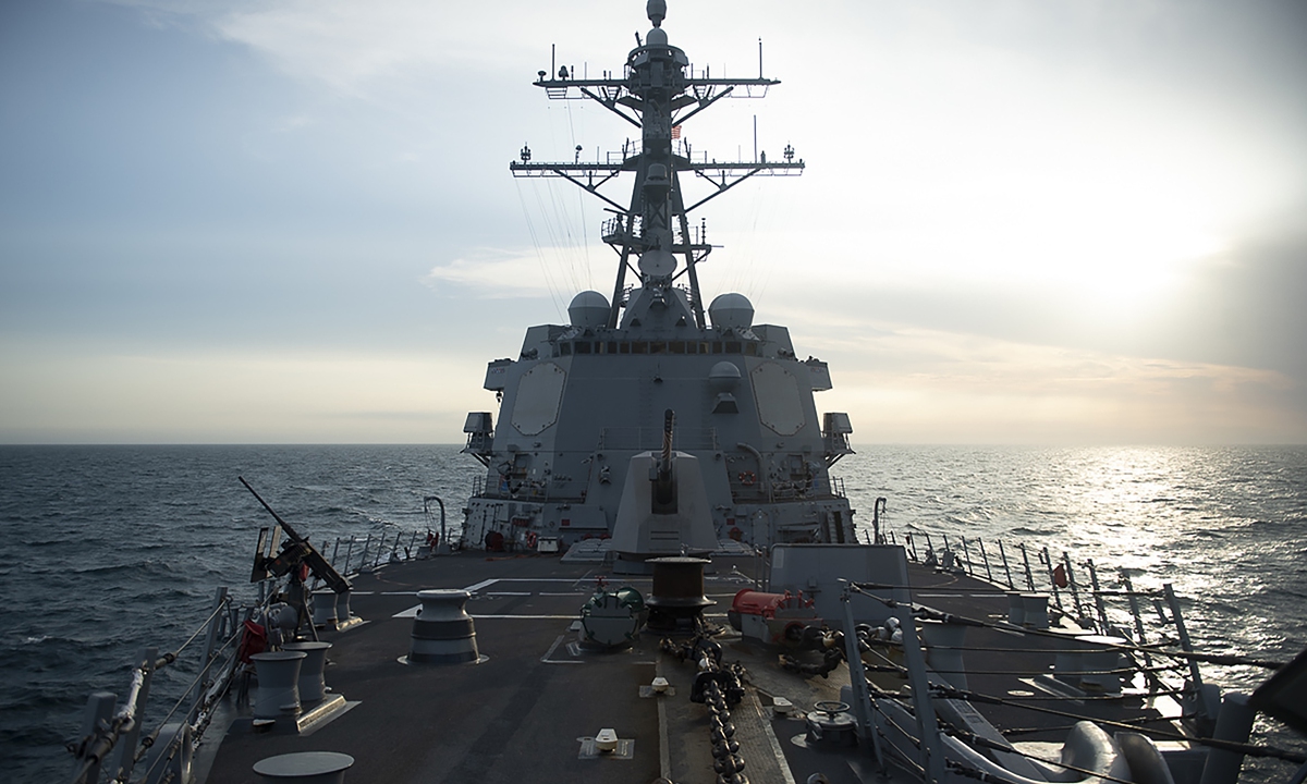 . Torpédoborec s řízenými střelami USS Sampson proplul Tchajwanským průlivem 26. dubna 2022.