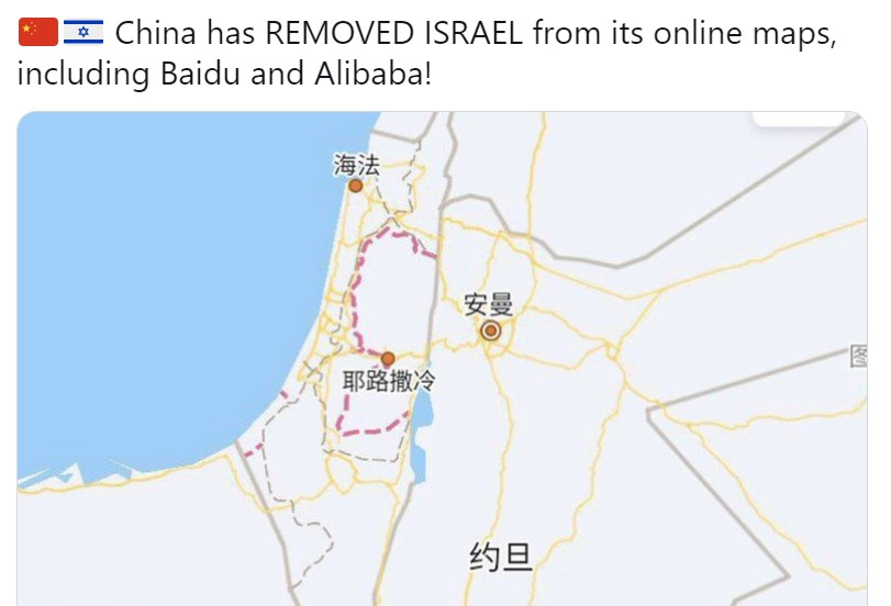 🇨🇳🇮🇱 China has REMOVED ISRAEL from its online maps, including Baidu and Alibaba! pic.twitter.com/UwcD86N3Pz