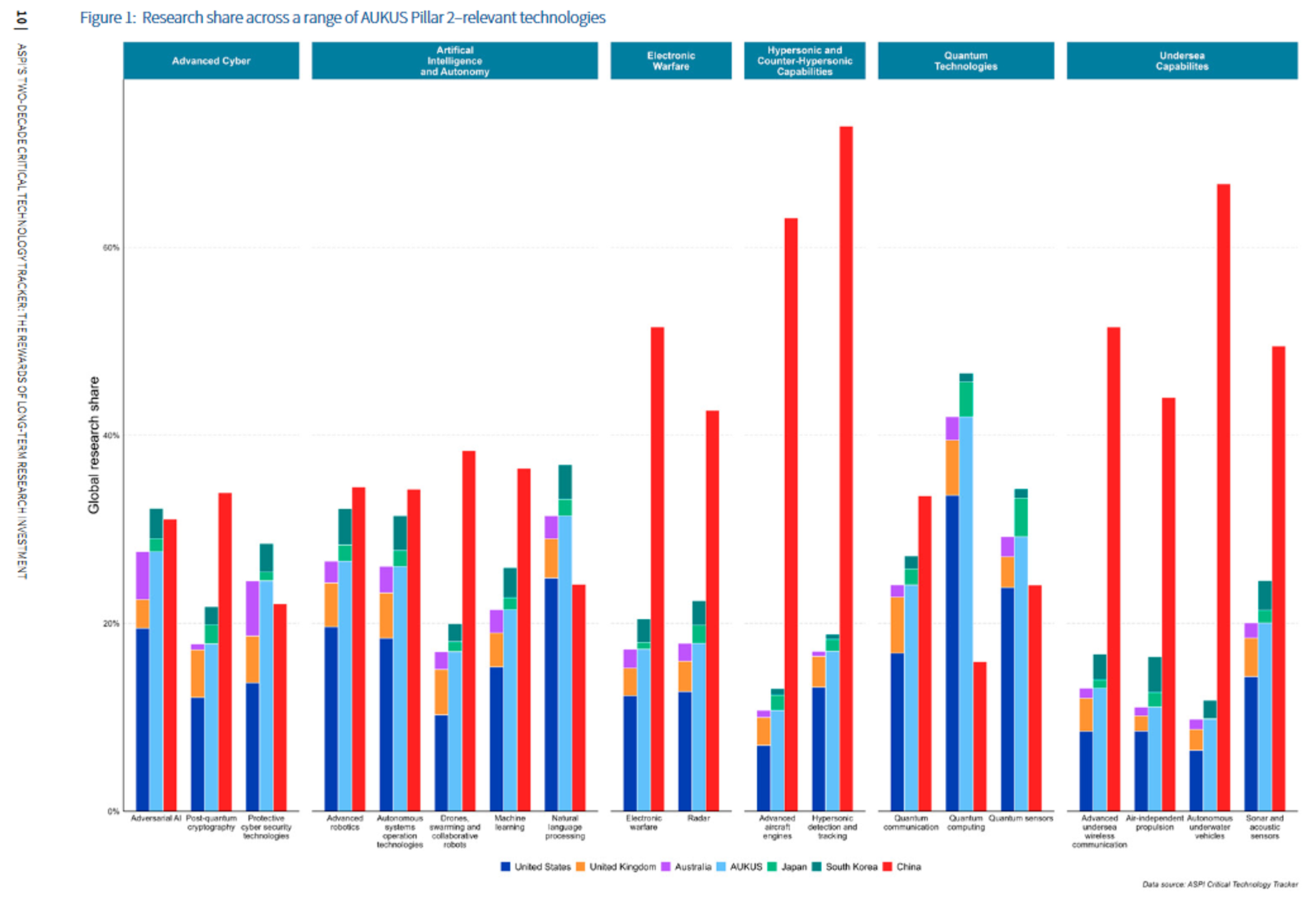 Komplexná 20-ročná štúdia, ktorú v roku 2024 zverejnil Austrálsky inštitút pre strategickú politiku (Australian Strategic Policy Institute - ASPI), vypočítala, že Čína dominuje nad USA v 57 zo 64 kritických technológií, pričom v roku 2007 to boli len tri.