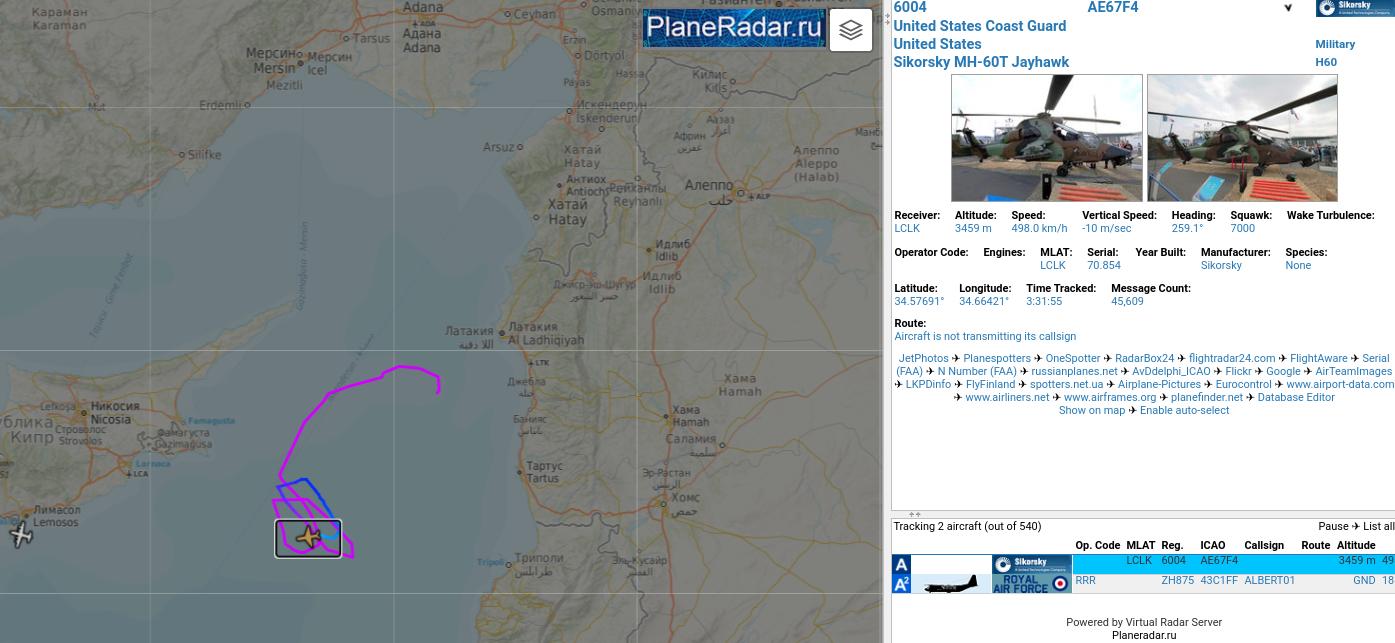 Momentálně léta kolem pobřeží Sýrie nějaký průzkumný letoun na výšce 9.4km, vydávající se za nějaké hausnumero - vrtulník, což bude asi US NAVY P-8A podle trajektorie. http://planeradar.ru