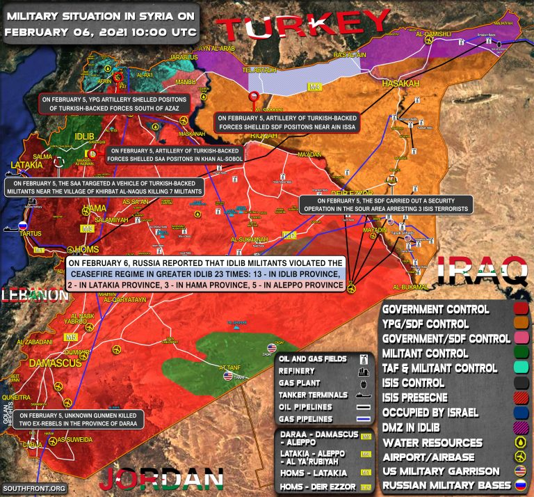 Počas zrážok s frakciami Sýrskej revolúcie vo vnútri dediny Al-Fatatrah v Džabal Šašaba bolo zabitých viac ako 15 príslušníkov proasadovských síl vrátane dôstojníkov a desiatky zranených. Vojenská situácia v Sýrii 6. februára 2021 (aktualizácia mapy)