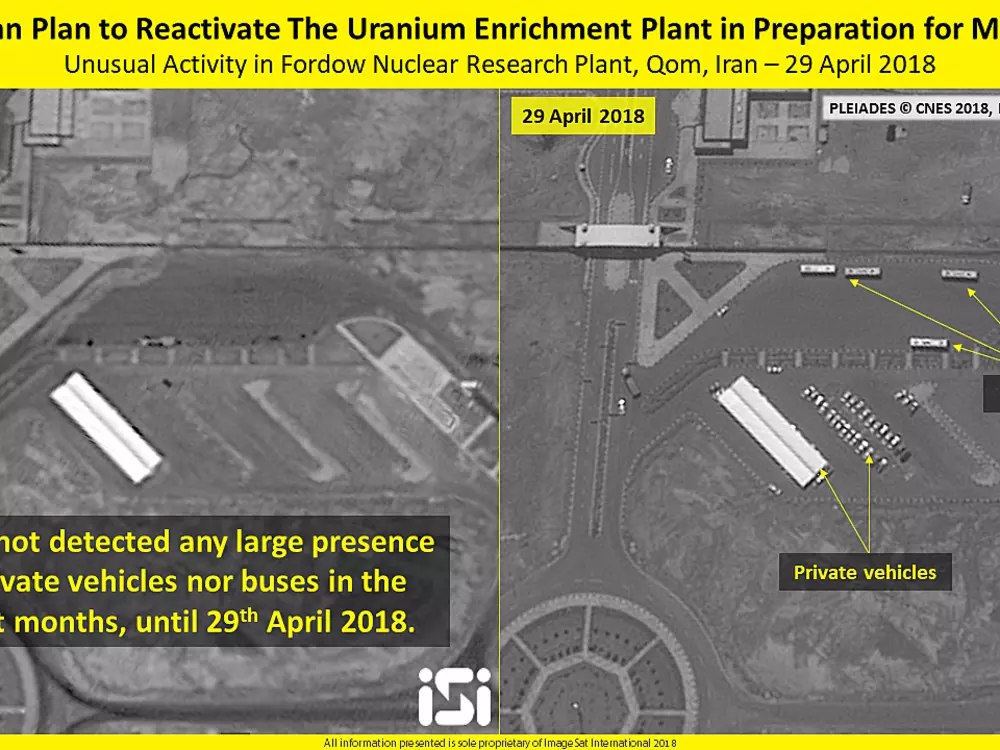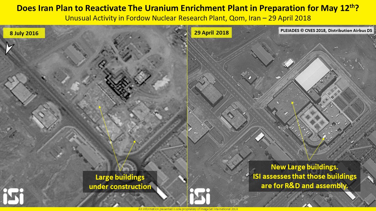 Ve čtvrtek 3. května izraelská společnost ImageSat, provozovatel družice Eros-B, zveřejnila obrázky, které ukazují neobvyklou činnost na území iránské továrny na obohacování uranu ve společnosti Fordo.