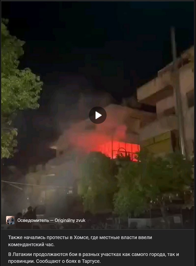 Protesty sa začali aj v meste Homs, kde miestne orgány zaviedli zákaz vychádzania. V Latakii pokračujú boje v rôznych častiach mesta aj provincie. Boje sú hlásené aj v Tartuse. Zatiaľ málo info, proalávitské kanály informujú o obsadzovaní pozícií a takmer o mestách, zatiaľ čo oficiálne provládne zdroje všetko popierajú a píšu presný opak. Vo všeobecnosti, ako vždy. Jediné, čo je určite pravda, je, že aktuálne vláda presúva posily k pobrežiu a pripravuje sa na vyčistenie v každom zmysle slova.
