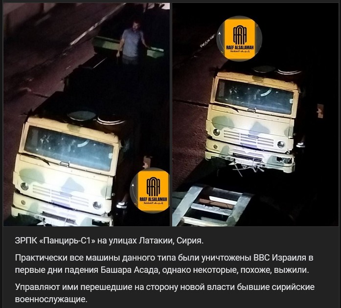 Zdroj https://vk.com/wall-123538639_4586390 z 28.05.2025PVO krátkeho dosahu Pancir-S1 (Панцирь-С1) v uliciach Latakie, Sýria. Takmer všetky tieto vozidlá zničilo izraelské letectvo v prvých dňoch pádu Baššára al-Asada, ale zdá sa, že niektoré prežili. Obsluhujú ich bývalí sýrski vojaci, ktorí prebehli k novej vláde.