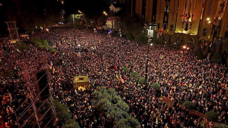 Situace před budovou parlamentu v centru Tbilisi Prezidentka Salome Zurabišviliová včera v 19:00 oznámila (https://t.me/regnum_na/64936), že se zde koná velký protest nespokojenců s výsledky voleb. Představitelé opozičních stran, které prošly do parlamentu, v tuto chvíli přesvědčují západní velvyslance, že volby byly zmanipulované a jejich výsledky by neměly být uznány.