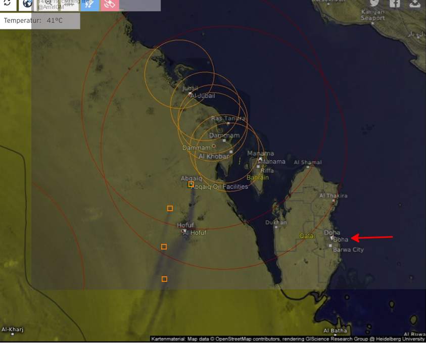 za povšimnutie stojí aj Doha - hlavné mesto Kataru. Je "v dosahu", ale Katar má hodne silnú PVO - 11 oz Patriot PAC-3, 12 oz THAAD, 18 oz Rapier