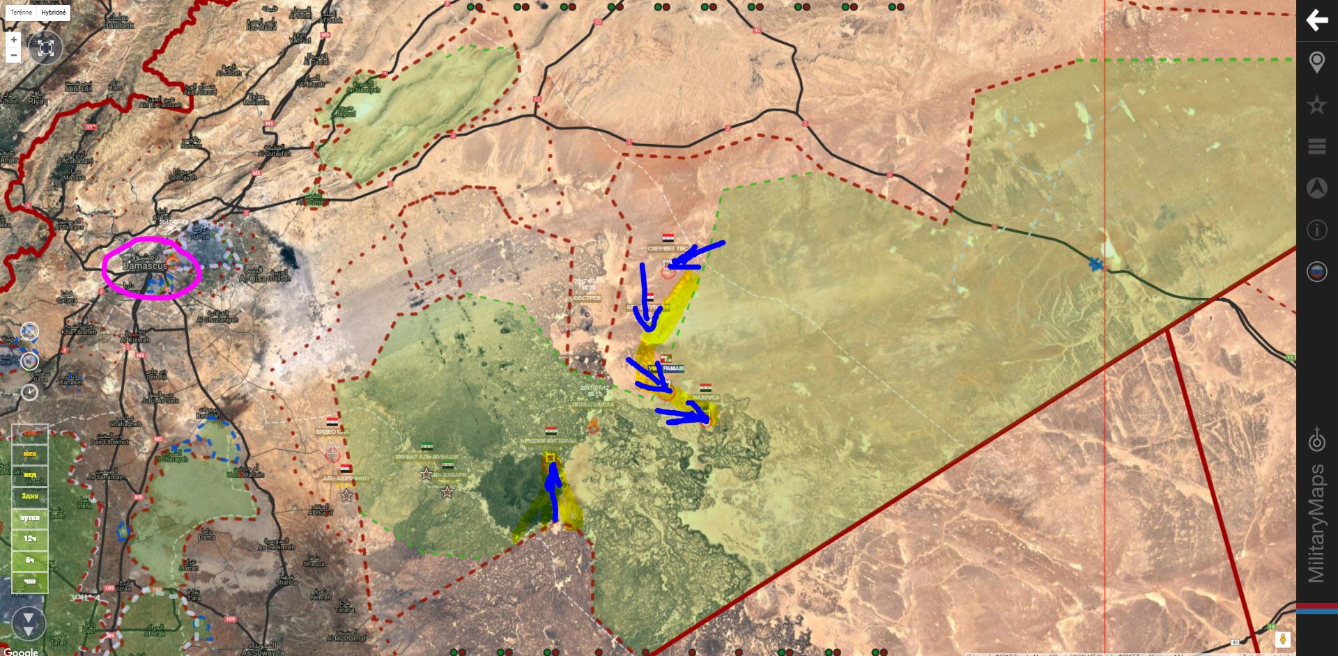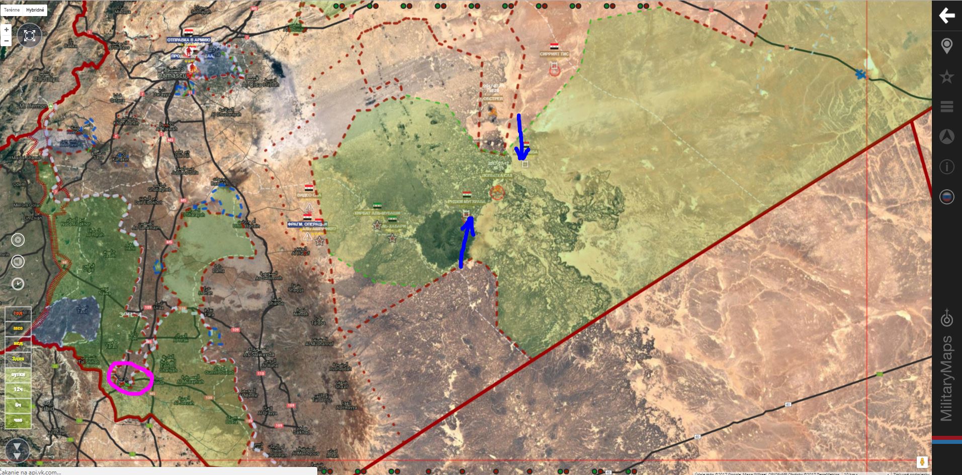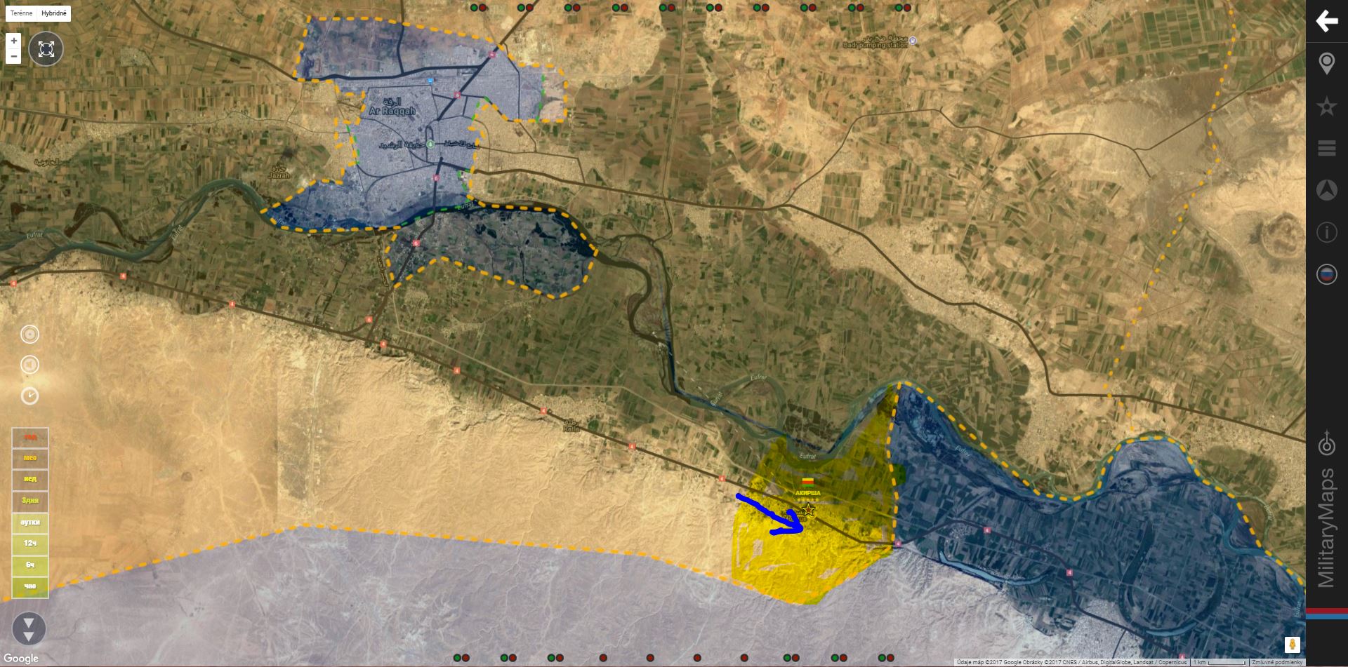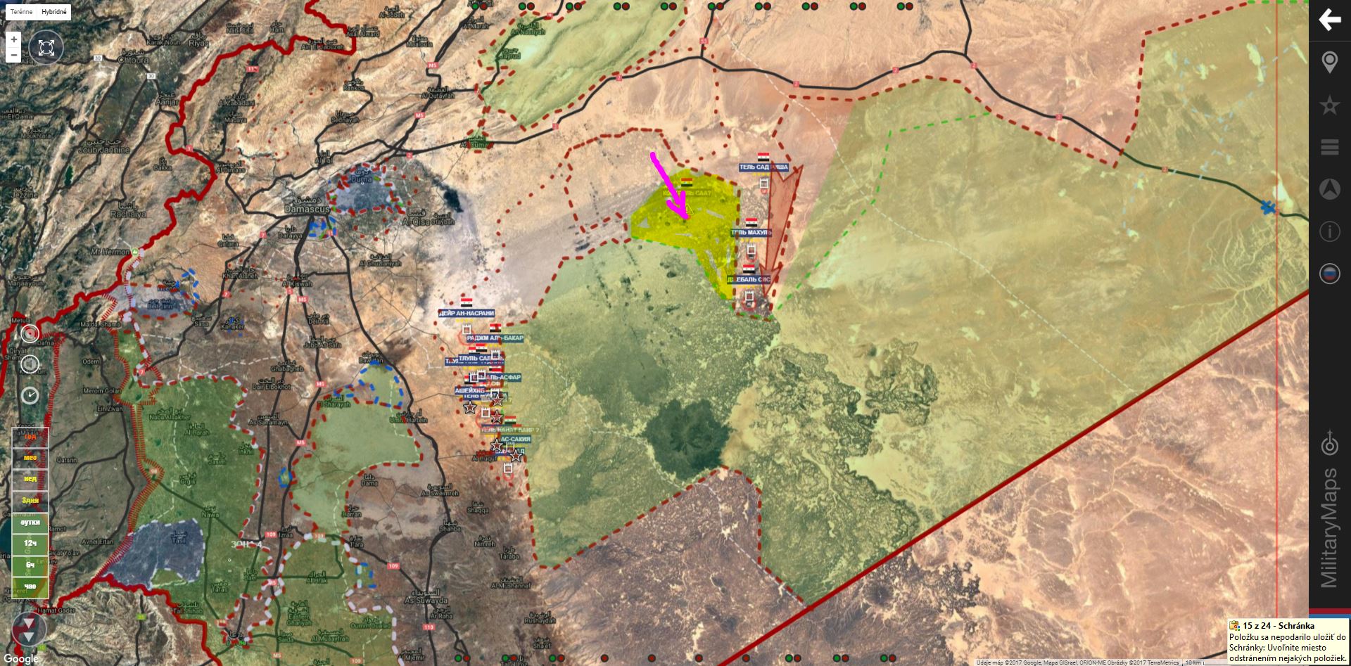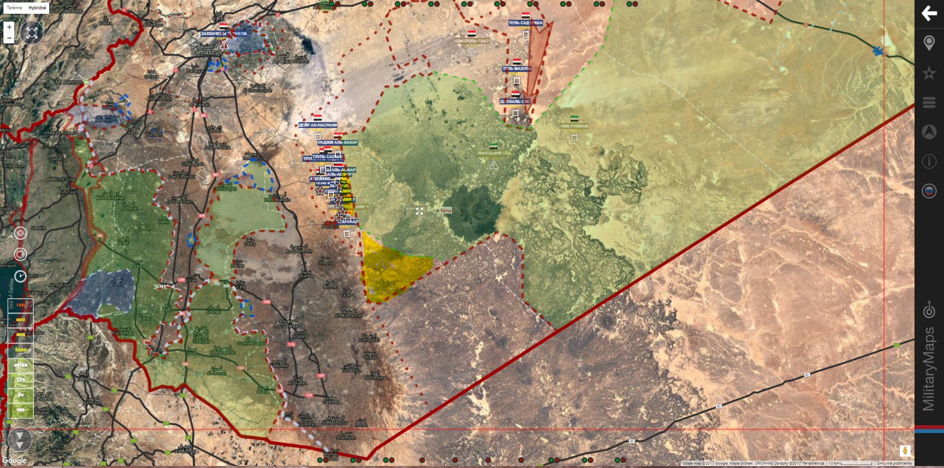 Aktualizácia mapy podľa MiliearyMaps, včera:IgorT píše: ↑10 črc 2017, 14:47SAA+ je "v laufe", získala ďalšie územie (Risha dam & hill, Jabal Makhoul, Bīr Makhoul & Sees mountain )IgorT píše: ↑10 črc 2017, 12:54SAA+ vrazila do územia rebelov obsadením Jabal Sis, Tel Makhoul a Tel SidrišaIgorT píše: ↑10 črc 2017, 12:18Daraa. SAA+ udrela SV od mesta a získala územie od Tlul Salman na severe po Tel Saad na juhu.