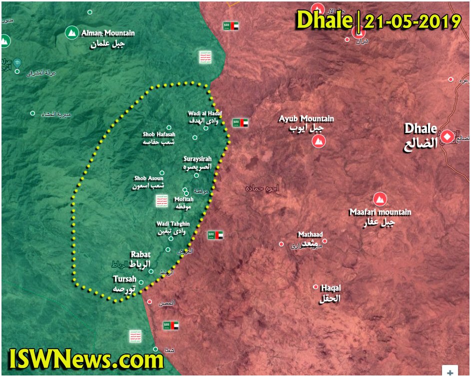 Dne 21. května dobili Ansar Alláh(Huti) a jeich spojenci 13 vesnic, včetně Wadi al-Hadaf, Shob Hafash, Suraysirah a Shob Asoun, na saudských vojscích v jemenské provincii Dhale. Podle zdrojů pro-Ansara Alláha bylo v nedávné sérii střetů zabito více než 50 vojáků.