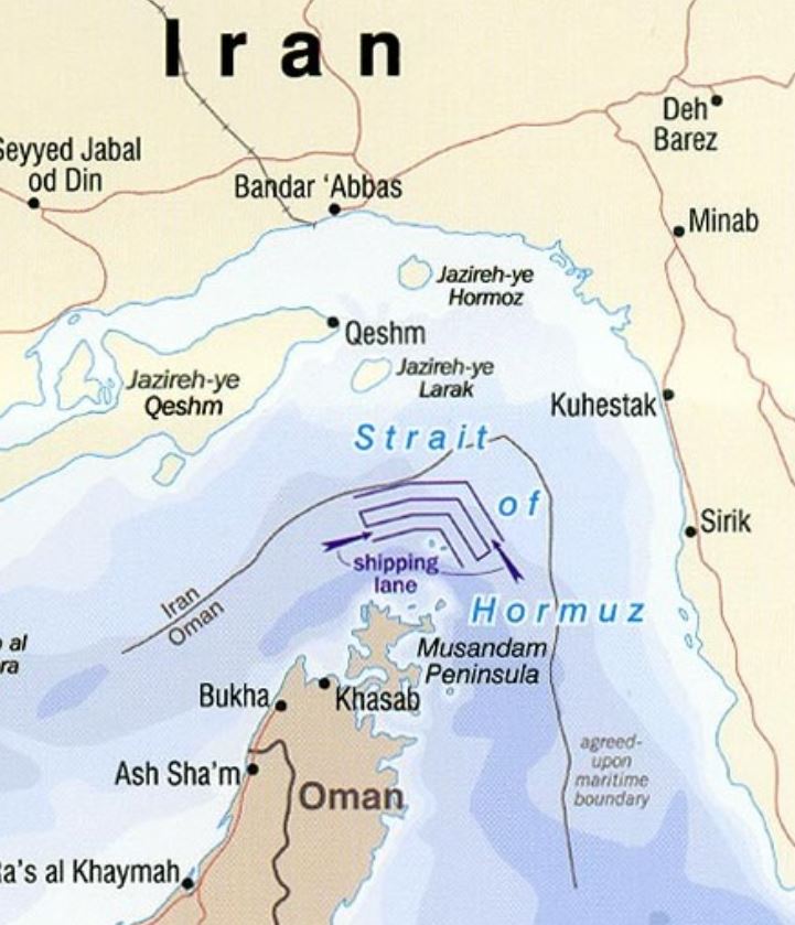 Hranice mezi Iránem a Ománem vede středem průlivu = vody Hormuzského průlivu jsou teritoriálními vodami buď Ománu nebo Íránu