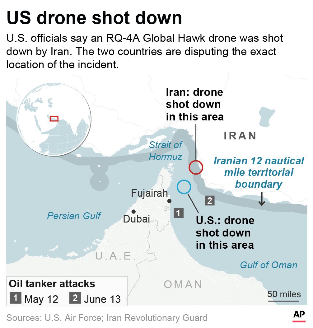 Íránský ministr zahraničí Mohammad Džavád Zaríf ve čtvrtek na Twitteru sdílel mapu, kde ukázal místo, kde íránské síly sestřelily americký dron. Dále zdůraznil, že jeho trosky byly nalezeny v íránských vodách. Věc chce předložit OSN.
