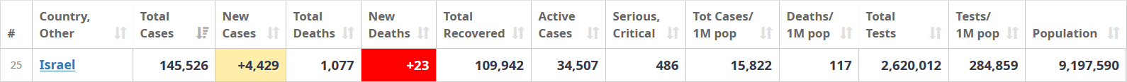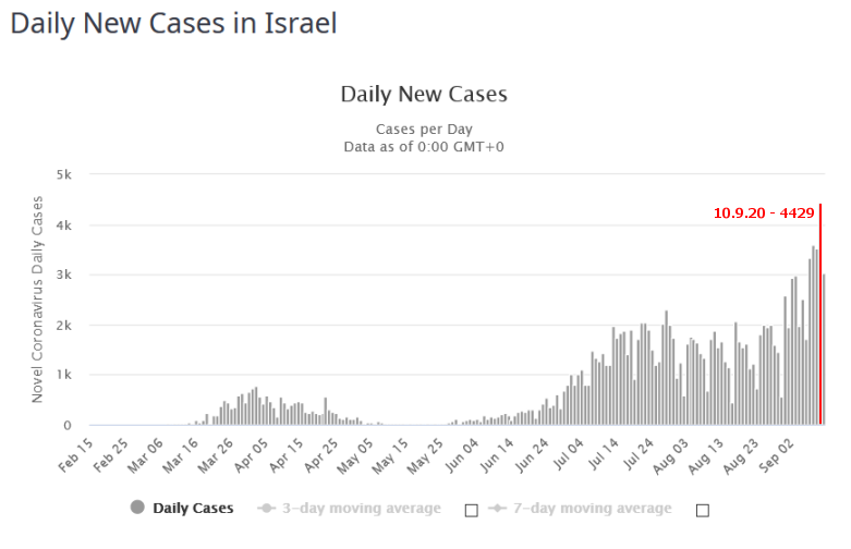 Izrael eviduje opětovný nárůst nakažených od května, kdy uvolnil celostátní uzávěru zavedenou na začátku pandemie. Minulý týden země podle údajů americké Univerzity Johnse Hopkinse (JHU) zaznamenala největší přírůstky nově nakažených na světě v přepočtu na obyvatele.
