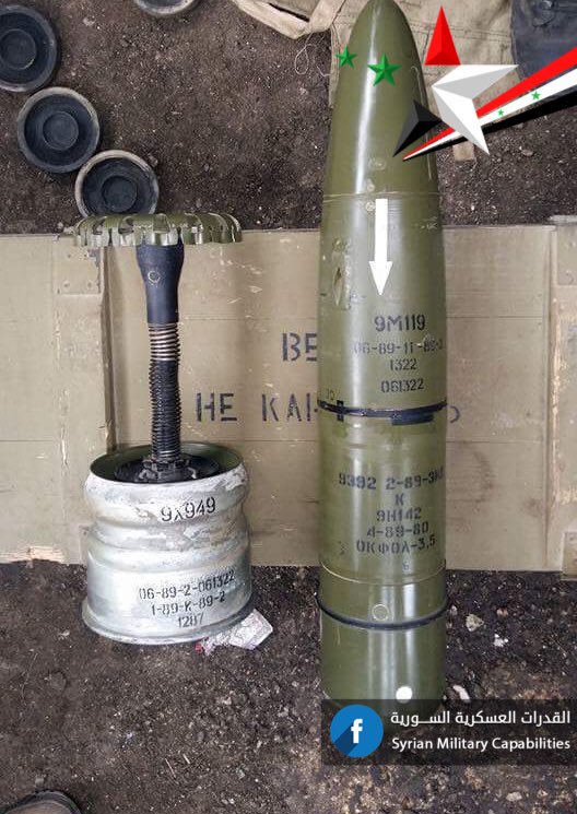Syrská armáda poprvé ukázaly řízenou raketou 9M119 "Reflex". Zvláštností je navádění po laserovém paprsku. Takové střely mohou být součástí střeliva tanku T-90, T-90A a T-72B3. Kódové označení NATO je TUR-AT-11 "Sniper". Více zde: https://vk.com/bolshayaigra_war?w=wall-104764077_51190