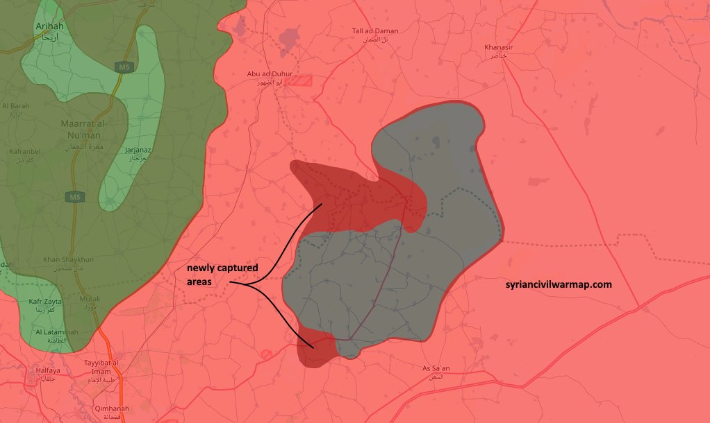 Uskupení syrské arabské armády vytlačilo teroristy "islámského státu" z prostoru: Abu Hilal, Rasm Taval, Ad-Dabahin, Wadi Jahannam a Muwaylikh Shimali na severu provincie Ham a také z osad Abu Dureyha, Maslah, Umm Ibba, Umm-Adj, Al-Kharash, Al-Suleijah a Mureijib al-Suleijah v jižních provinciích Idlib a Aleppo
