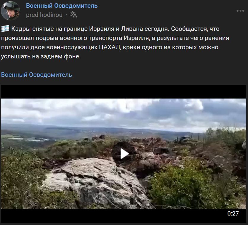 Zábery z izraelsko-libanonskej hranice z utorka 21.03.2023. Údajne došlo k výbuchu Izraelského vojenského vozidla, pričom boli zranení 2 vojaci IDF, z ktorých jedného je počuť v pozadí kričať od bolesti.