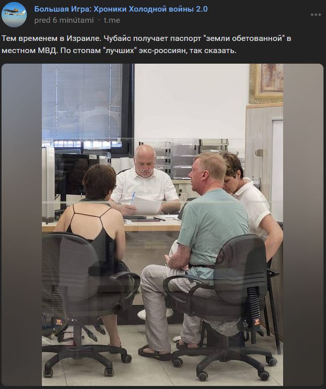 Medzitým v Izraeli. Čubajs (Чубайс) dostáva pas "zasľúbenej krajiny" na miestnom Ministerstve vnútra. Takpovediac po stopách "najlepších" bývalých Rusov, tak by som povedal.