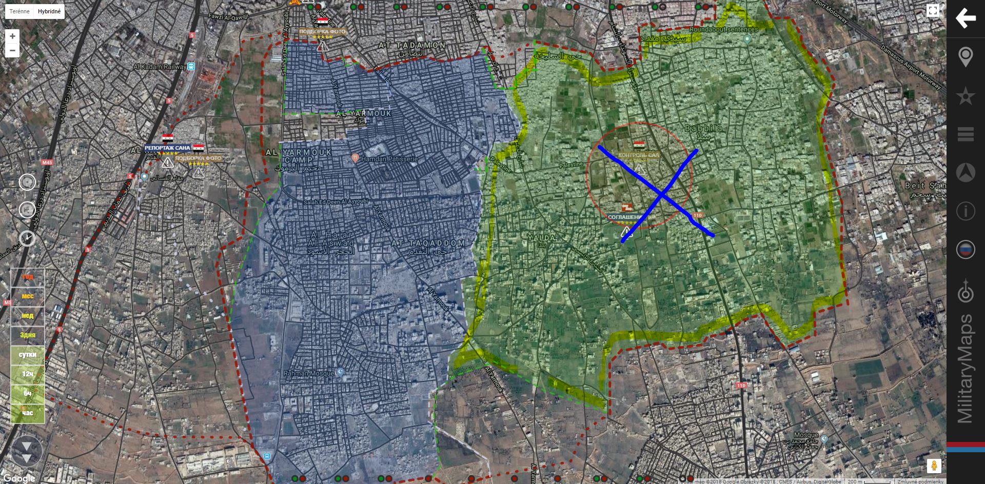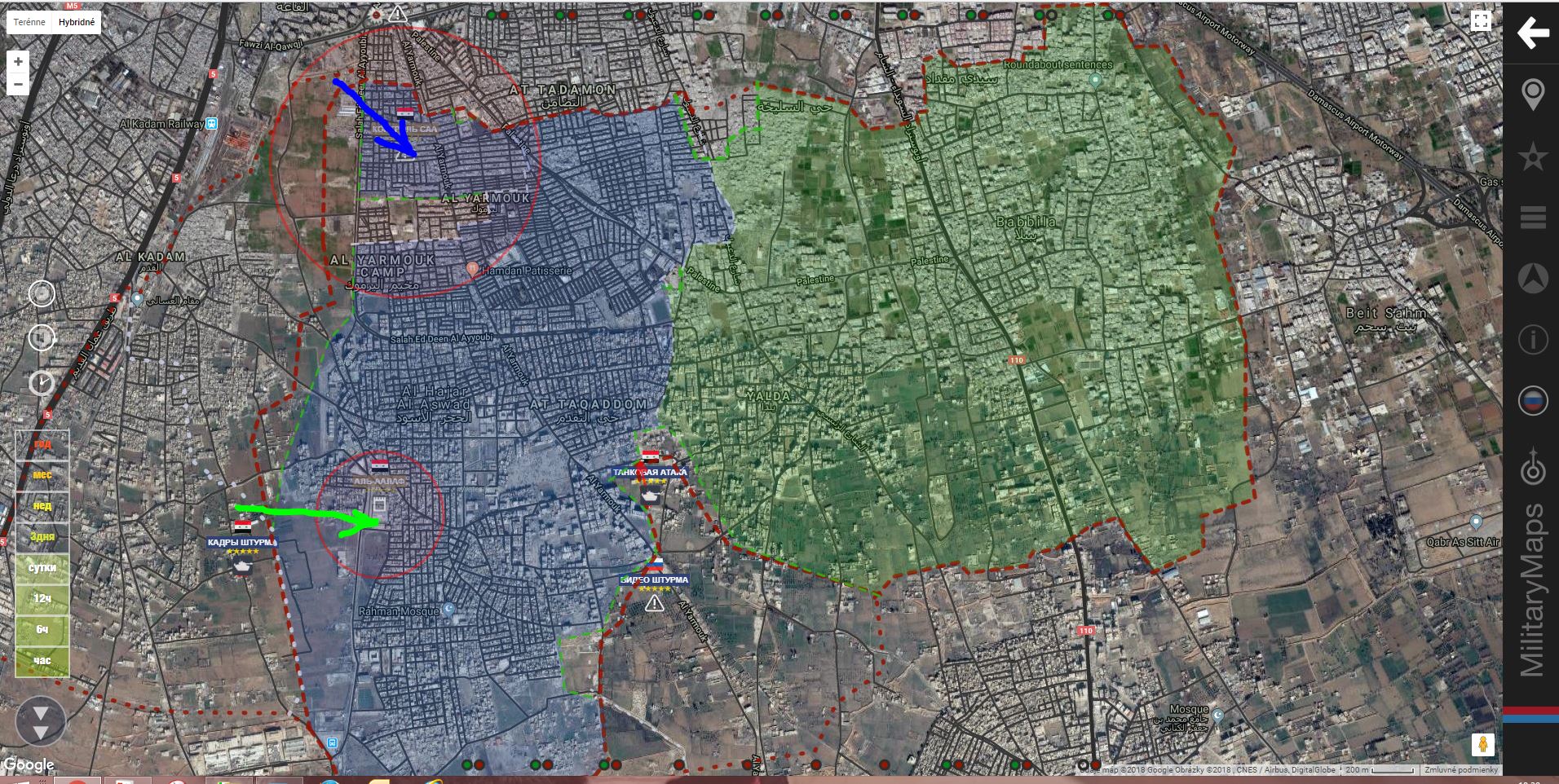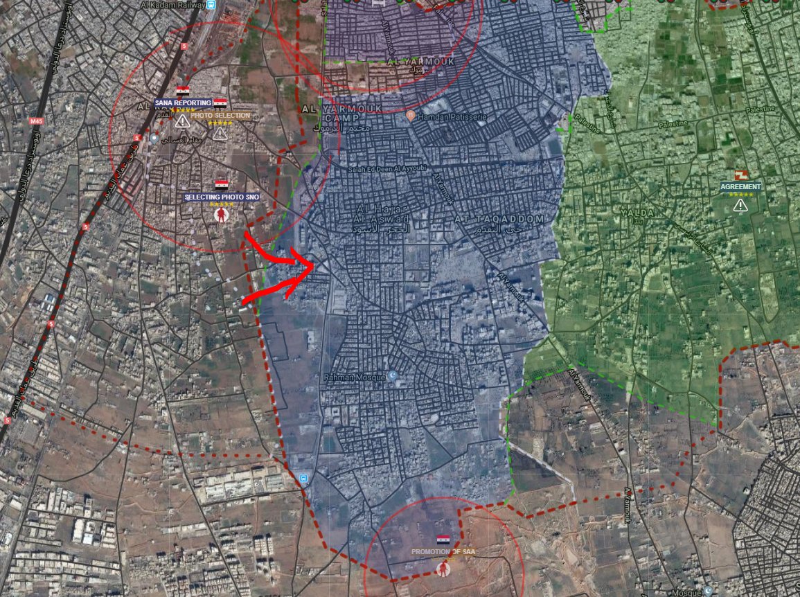 nad oblasťou v tábore Yarmuk, ktorú predtým kontrolovali militanti HTS po ich vývoze do Idlibu. V západnej časti kotla sa dostali po