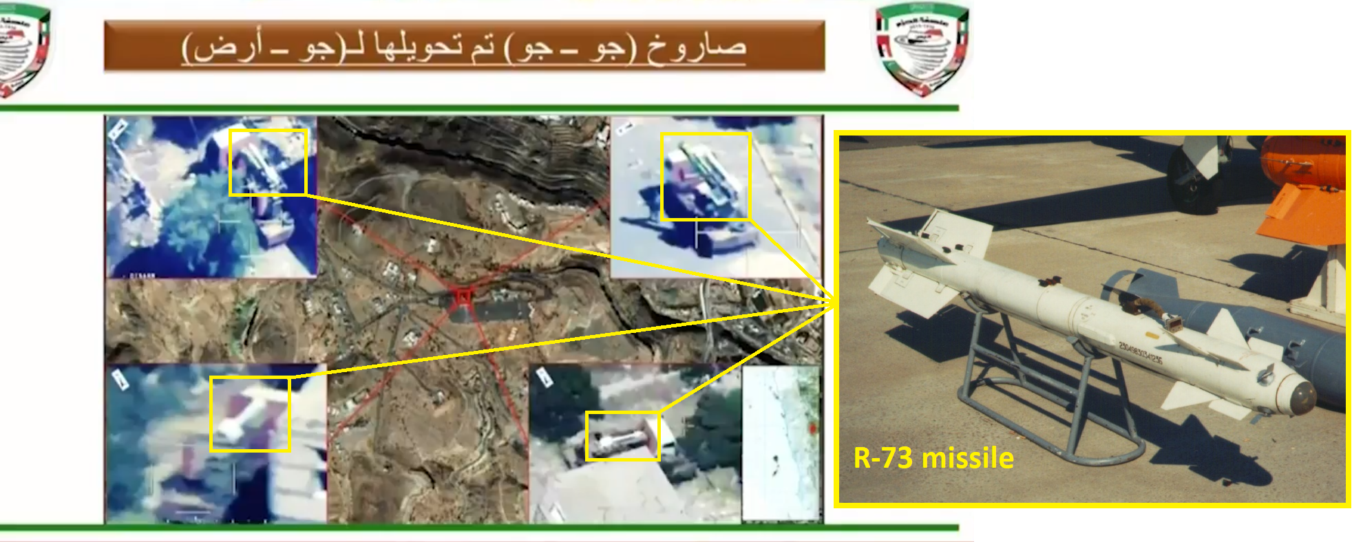 Plukovník letectva, hovorca Saudskej koalície na tlačovej konferencii odhalil snímky improvizovaných odpaľovacích zariadení pre ex-Sovietske A-A rakety rodiny R-73 a R-27T umiestnené na motorových vozidlách.