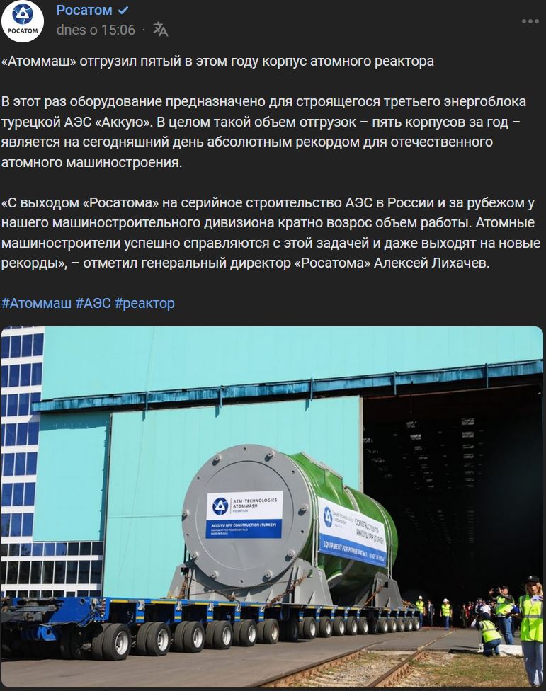 "So spustením sériovej výstavby AES v Rusku a v zahraničí za pomoci Rosatomu sa niekoľkonásobne zvýšilo pracovné zaťaženie našej strojárskej divízie. Jadroví strojári sa s touto úlohou úspešne vyrovnávajú a dokonca prekonávajú nové rekordy," povedal generálny riaditeľ Rosatomu Aleksej Lichačev (Алексей Лихачев).