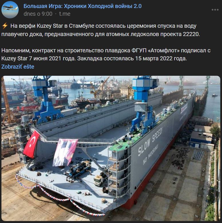 V lodenici "Kuzey Star" v Istanbule sa uskutočnilo slávnostné spustenie na vodu plávajúceho doku určeného pre A-ľadoborce projektu 22220. Zmluva o výstavbe plávajúceho doku medzi FGUP Atomflot (ФГУП Атомфлот) a Kuzey Star bola podpísaná 07.06.2021. Začiatok výroby začal 15.03.2022. Podľa podmienok zmluvy bude výstavba vrátane dodania plávajúceho doku do prístavu Murmansk (Мурманск) trvať 29 mesiacov (termín do 07.11.2023). Dok je dlhý 220 metrov, široký 48 metrov a má nosnosť 30 000 ton.