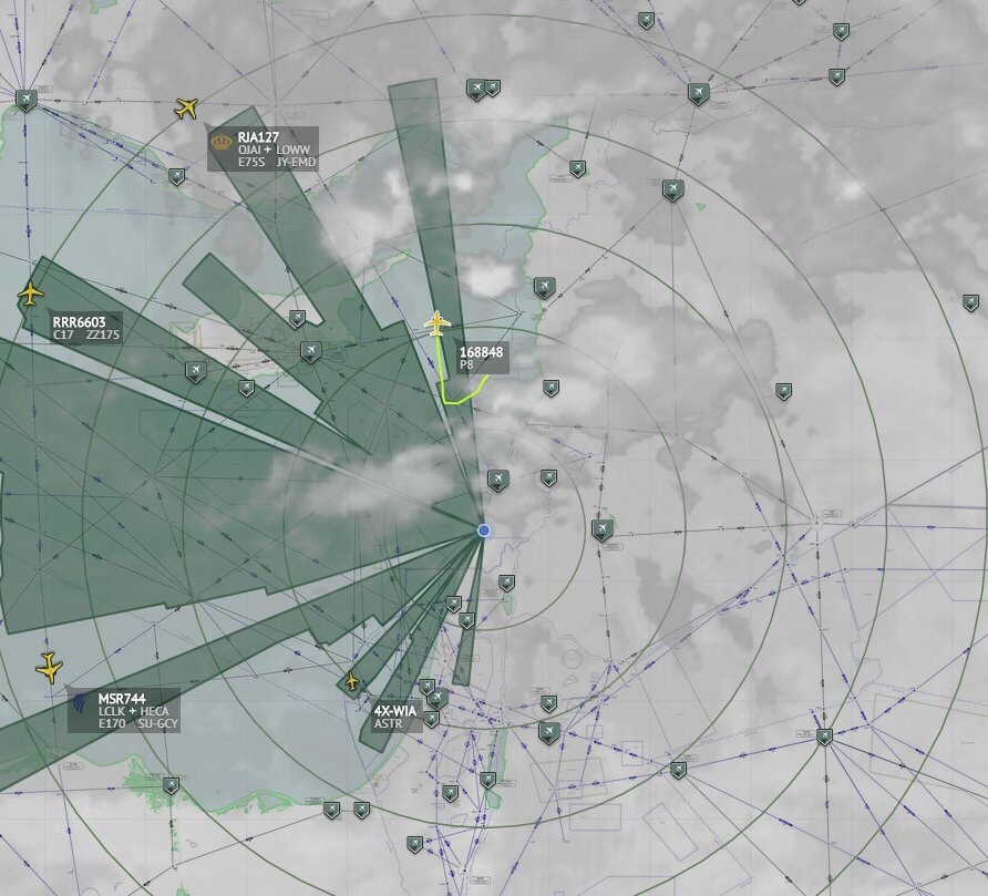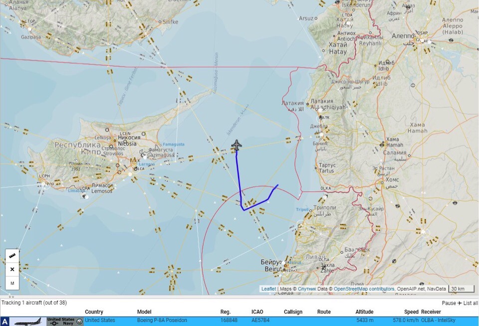 Boeing USAF P-8A Poseidon slídí u syrského pobřeží poblíž letecké základny Chmejmim