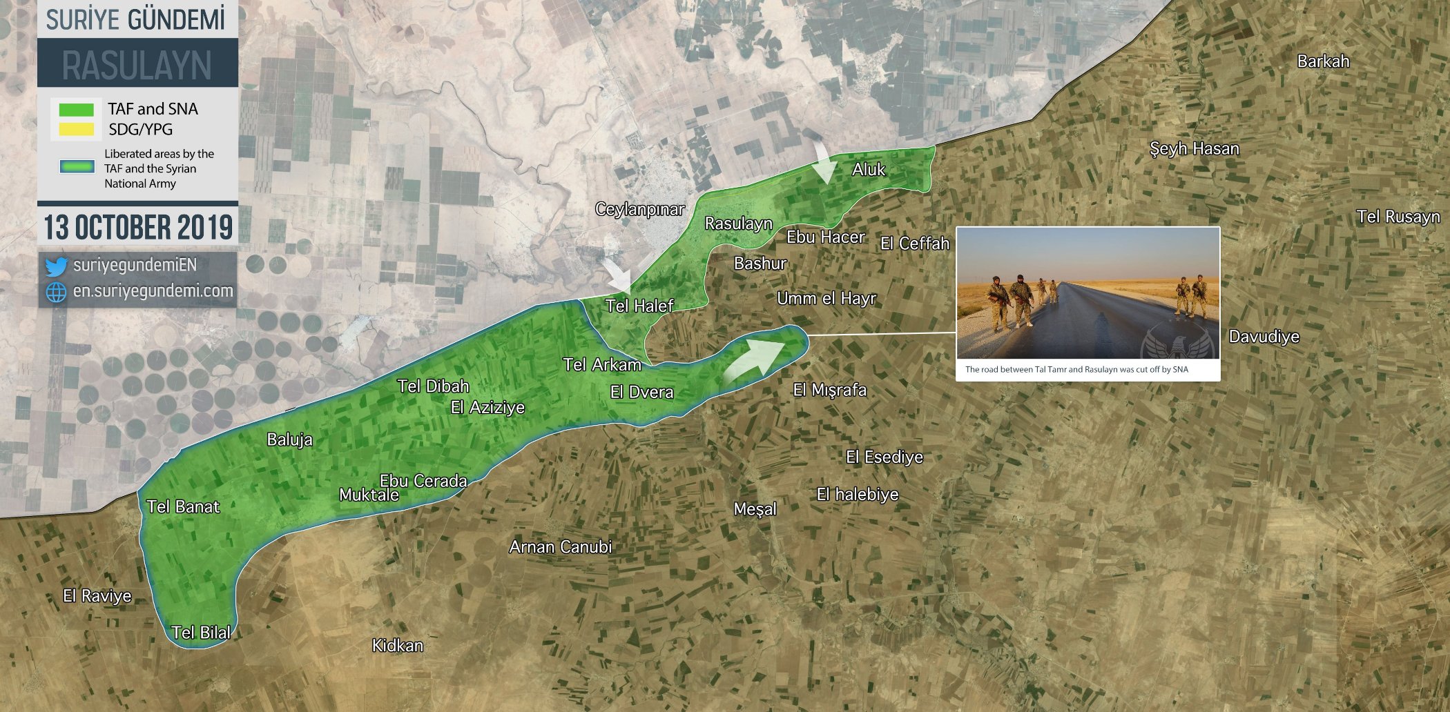 Turecká armáda a tzv. Národní syrská armáda (NSA) postupovaly 13. října západně od města Ras al-Ayn na severu oblasti Al-Hasakah a obsadily několik vesnic podél hranice s Tureckem.