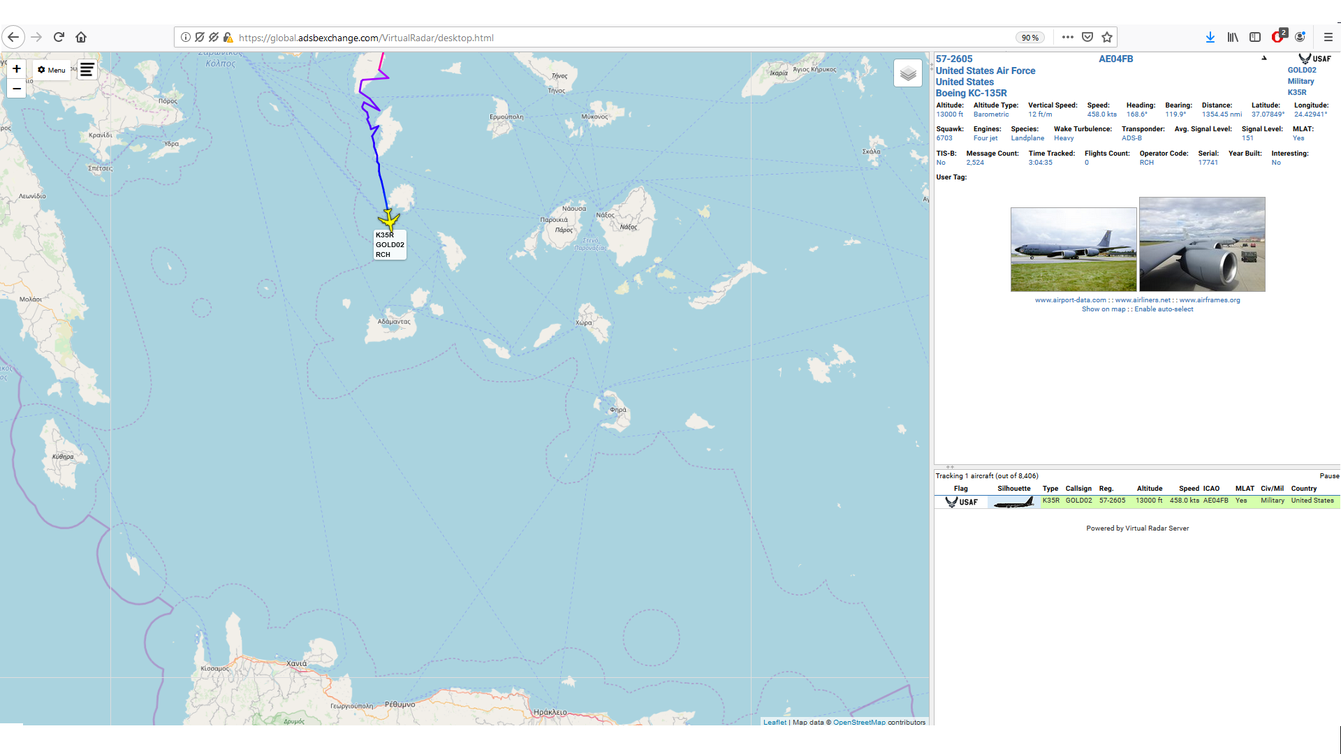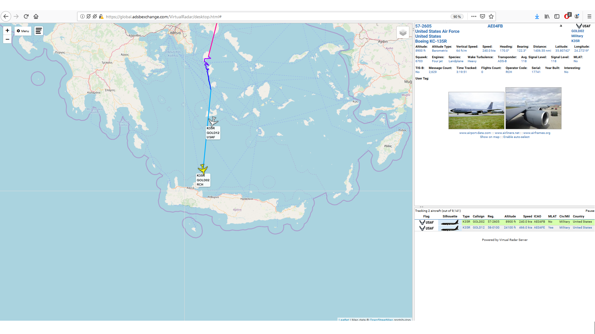 Prvý KC-135R už v Egejskom mori ( za cca dve min.klesol z 20 100ft na 13 000ft a drží hladinu ), zároveň nad Krétou už dnes spomínaný Švédsky Gulfstream Korpen