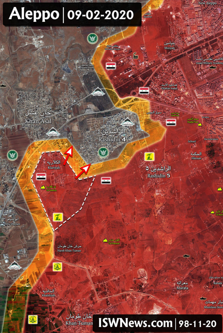 Jednotky sýrskej armády oslobodili oblasti Tal Kalariyah a Kalariyah a postupovali na pozície militantov v okrese Rashidin 4 v meste Aleppo. Rašidín 4 je jedným z mála predmestí mesta, ktoré zostalo v rokoch v rukách militantov.