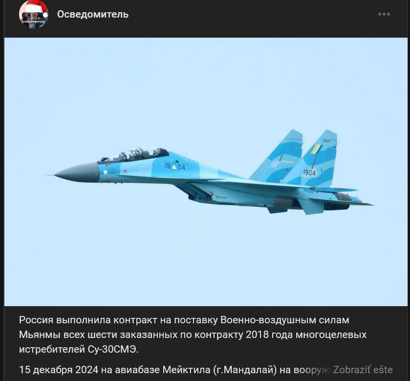 Rusko splnilo kontrakt na dodávku všetkých 6 viacúčelových lietadiel Suchoj Su-30SME (Су-30СМЭ) pre mjanmarské vzdušné sily, ktoré boli objednané v rámci kontraktu z roku 2018. V nedeľu 15.12.2024 boli na leteckej základni Meiktila (Mandalaj) prijaté do služby 2 lietadlá Su-30SME. Kontrakt na dodávku 6 lietadiel Suchoj Su-30SME bol podpísaný v roku 2018. Hodnota kontraktu sa odhaduje na 400 miliónov $. Slávnostné prevzatie prvej dvojice (čísla 1904 a 1905) sa uskutočnilo 15.12.2022, ďalšie dve (čísla 1906 a 1907) boli dodané 15.12.2023, viď https://vk.com/wall-123538639_3958799.