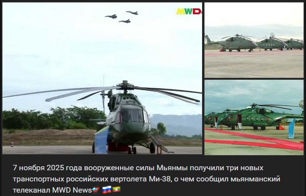 V piatok 07.11.2025 dostali ozbrojené sily Mjanmarska 3 nové ruské transportné vrtuľníky Miľ Mi-38, o čom informovala mjanmarská televízna stanica MWD News