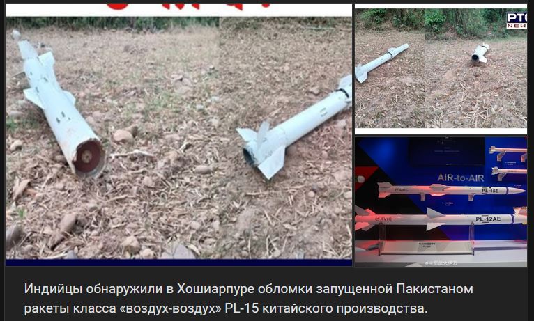 Zdroj https://vk.com/wall-123538639_4567762 z 09.05.2025Indovia našli zbytky rakety vzduch-vzduch PL-15 čínskej výroby, ktorú Pakistan odpálil v okolí mesta Hoshiarpur