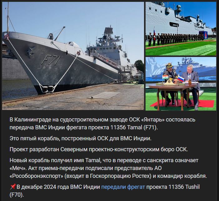 Ide o 5. loď, ktorú OSK postavila pre indické VMS Indie. Nová loď dostala meno Tamal, čo v sanskrite znamená „Meč“. Preberací akt podpísal zástupca Rosoboronexportu (súčasť štátnej korporácie Rostech) a veliteľ lode. V 12/2024 odovzdali VMS Indie fregatu projektu 11356 Tushil (F70). Zdroj https://vk.com/wall-123538639_4631643 z 01.07.2025