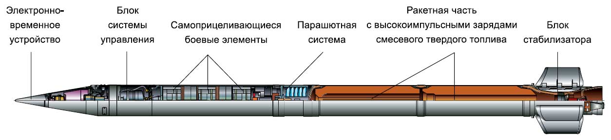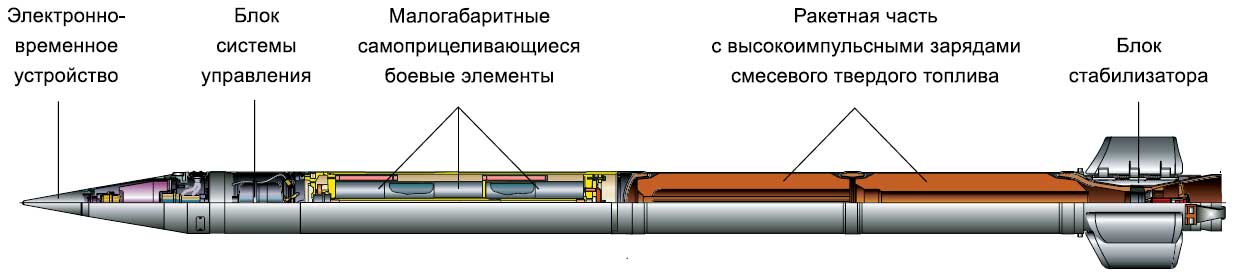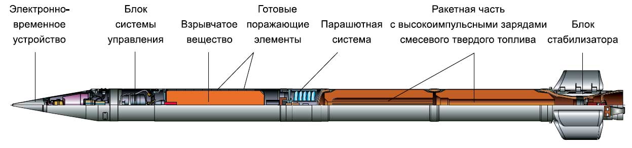 "Raketové střely vyvinuté pro Smerch MLRS mají unikátní konstrukci, která poskytuje přesnost zásahu, která je 2-3krát vyšší než u podobných zahraničních raketových dělostřeleckých systémů. Poprvé byly sovětské raketové dělostřelecké granáty řiditelné. Při jejich návrhu byl použit inerciální řídicí systém, který zajišťuje úhlovou stabilizaci střel v aktivní části trajektorie a korekci dostřelu v důsledku korekce na dobu separace bojové hlavice, určenou palubním zařízením v souladu s naměřeným parametry pohybu střely."Разработанные для РСЗО "Смерч" реактивные снаряды имеют уникальную конструкцию, обеспечивающую точность попадания, в 2-3 раза превышающую аналогичный показатель зарубежных систем реактивной артиллерии. Впервые снаряды советской реактивной артиллерии стали корректируемыми. В их конструкции была применена инерциальная система управления, обеспечивающая угловую стабилизацию снарядов на активном участке траектории и коррекцию дальности за счет поправки к времени отделения головной части, определяемой бортовой аппаратурой в соответствии с измеряемыми параметрами движения снаряда.