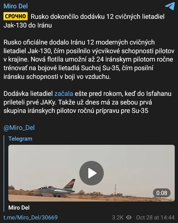 Zdroj https://t.me/Miro_Del/30669 z 28.10.2024Rusko oficiálne dodalo Iránu 12 moderných cvičných lietadiel Jak-130, čím posilnilo výcvikové schopnosti pilotov v krajine. Nová flotila umožní až 24 iránskym pilotom ročne trénovať na bojové lietadlá Suchoj Su-35, čím posilní iránsku schopnosti v boji vo vzduchu. Dodávka lietadiel začala ešte pred rokom (2023), keď do Isfahanu prileteli prvé JAKy. Takže už dnes má za sebou prvá skupina iránskych pilotov ročnú prípravu pre Su-35