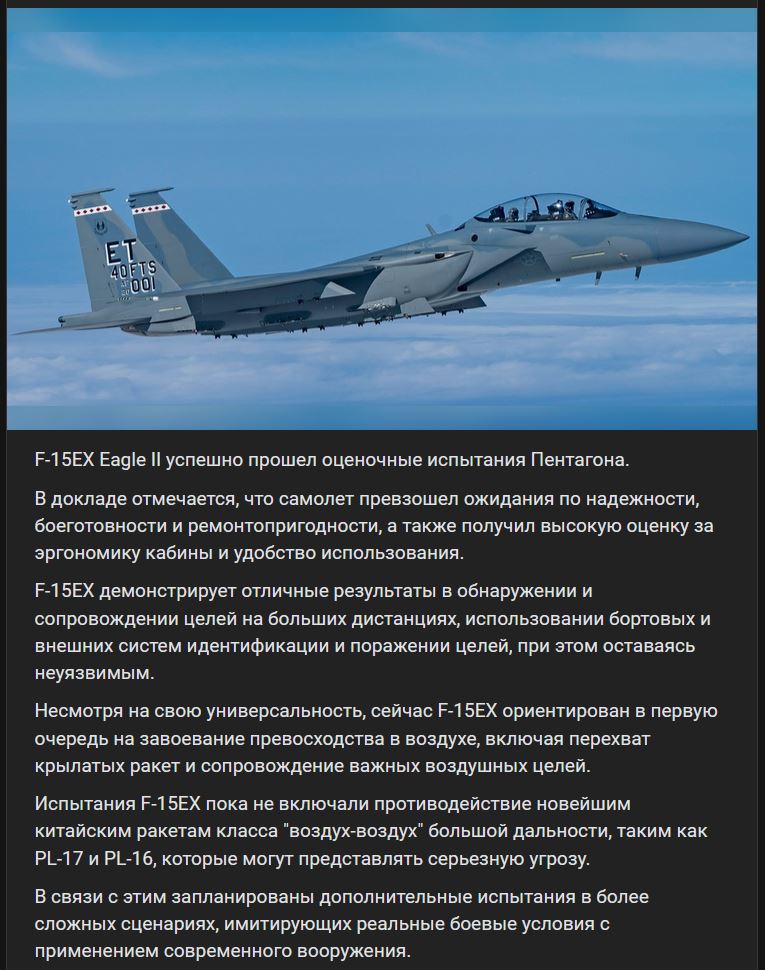 V správe sa uvádza, že lietadlo prekonalo očakávania z hľadiska spoľahlivosti, bojovej pripravenosti a udržiavateľnosti a získalo vysoké hodnotenie za ergonómiu a použiteľnosť kokpitu. Lietadlo F-15EX preukázalo vynikajúce výkony pri zisťovaní a sledovaní cieľov na veľké vzdialenosti, pri používaní palubných a vonkajších identifikačných systémov a pri zasahovaní cieľov, pričom zostalo "nepoškodené". Napriek svojej všestrannosti sa F-15EX v súčasnosti zameriava predovšetkým na získavanie vzdušnej prevahy vrátane zachytávania riadených striel a sprevádzania dôležitých vzdušných cieľov. Testovanie F-15EX zatiaľ nezahŕňalo boj proti najnovším čínskym raketám vzduch-vzduch dlhého doletu, ako sú PL-17 a PL-16, ktoré by mohli predstavovať vážnu hrozbu. Preto sa plánujú ďalšie testy v komplexnejších scenároch, ktoré simulujú reálne bojové podmienky s pokročilou výzbrojou. Zdroj https://vk.com/wall-123538639_4476367 z 09.02.2025
