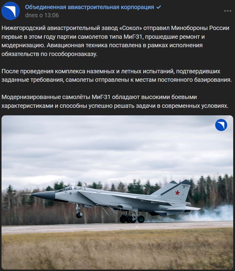 Letecký závod Sokol (Сокол) v Nižnom Novgorode dodal Ministerstvu obrany Ruska prvé série v tomto roku 2024 lietadiel rodiny MiG-31 (МиГ-31), ktoré boli opravené a modernizované. Lietadlá boli dodané v rámci plnenia záväzkov vyplývajúcich zo štátnej objednávky v oblasti obrany. Po vykonaní pozemných a letových skúšok, ktoré potvrdili stanovené požiadavky, boli lietadlá odoslané na svoju stálu domovskú základňu. Modernizované lietadlá MiG-31 majú vysoké bojové vlastnosti a sú schopné úspešne plniť úlohy v moderných podmienkach.