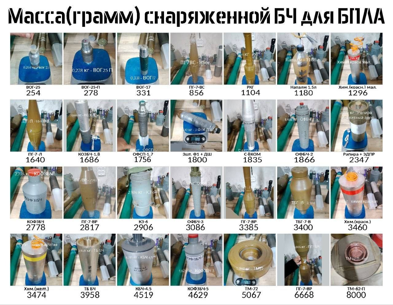 Približné hmotnosti (v gramoch) munície RF ozbrojených síl, používané v spojení s UAV.