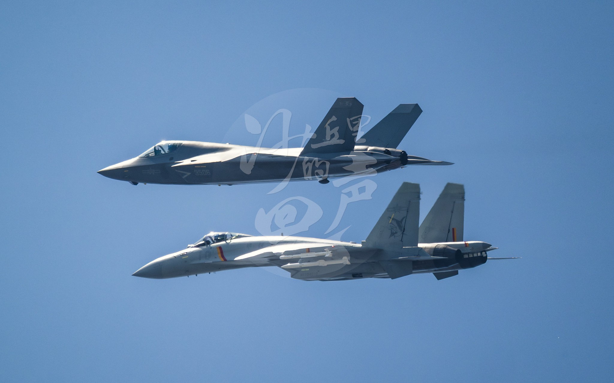 dva prototypy palubní verze J-35. Malosériová vyroba se ale již také rozběhla, takže je možné, že do zářijové přehlídky budou prototypy nahrazeny sériovými letouny. Součástí skupiny byly také nejpokročilejší čínské flankery J-15T (T=katapult), jimiž námořní letectvo už určitý čas nahrazuje postarší J-15A.